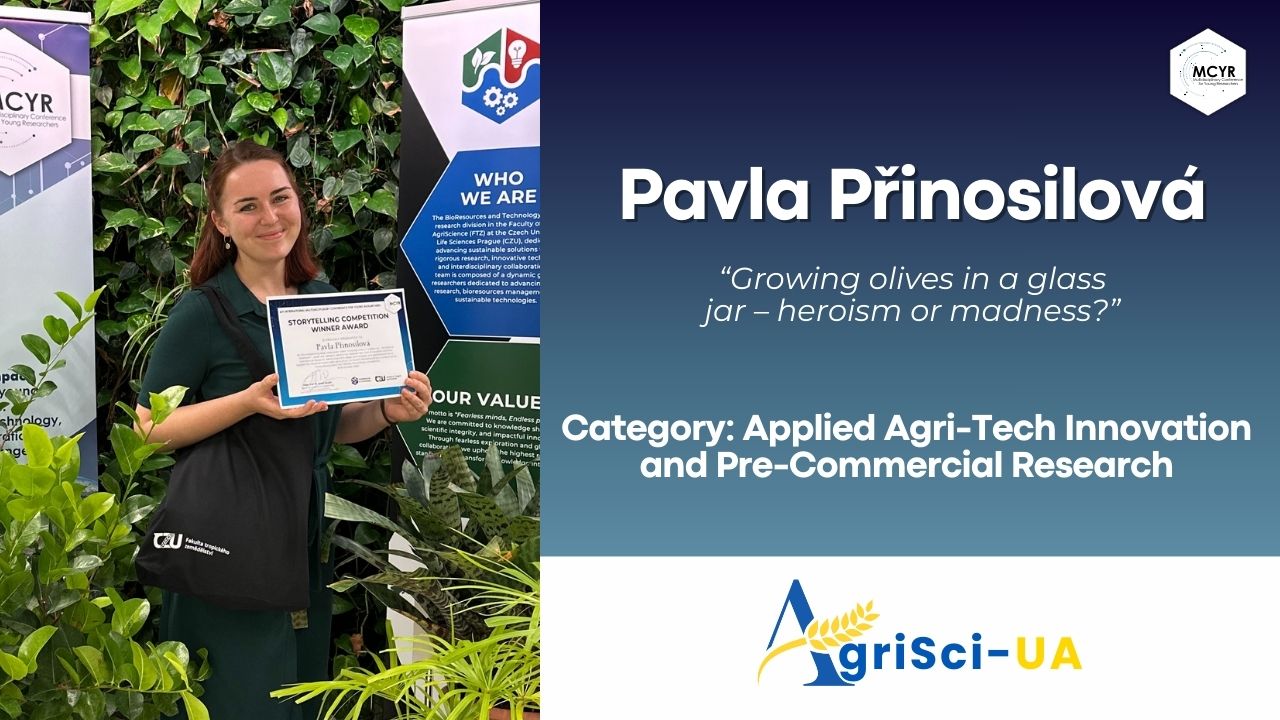 In the category AgriSci-UA: Applied Agri-Tech Innovation and Pre-Commercial Research, Pavla Přinosilová from the Institute of Genetics and Plant Breeding in Lednice, Faculty of Horticulture, Mendel University in Brno was recognised for her engaging submission, “Growing olives in a glass jar – heroism or madness?” Her story offers a creative, reflective look into early-stage agri-tech experimentation and the curiosity-driven research that fuels agricultural innovation. The winning narrative captures the essence of AgriSci-UA by highlighting how hands-on trials, unconventional thinking, and scientific exploration can shape the future of sustainable food production.