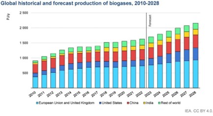 Global biogas production has grown steadily over the past decade, led by Europe and the United States, and is projected to accelerate through 2028 as more countries expand biogas capacity.